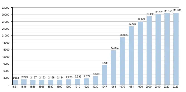 Elle comptait, au , 31 286 habitants (15 735 hommes et 15 551 femmes), soit une densité de 399,72 habitants/km²[3] pour une superficie de 78,27 km².