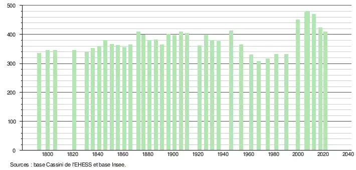 L'évolution du nombre d'habitants est connue à travers les recensements de la population effectués dans la commune depuis 1793. Pour les communes de moins de 10 000 habitants, une enquête de recensement portant sur toute la population est réalisée tous les cinq ans, les populations légales des années intermédiaires étant quant à elles estimées par interpolation ou extrapolation[23]. Pour la commune, le premier recensement exhaustif entrant dans le cadre du nouveau dispositif a été réalisé en 2007[24].