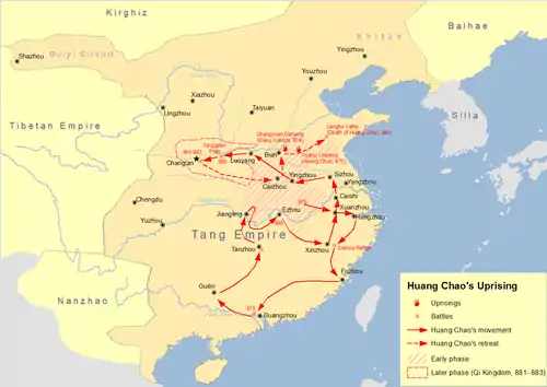 Cependant, alors que l'armée de Huang Chao se trouve dans la région de Lingnan, ses soldats tombent malades et 30 à 40% d'entre eux meurent. Ses principaux conseillers lui suggèrent de repartir vers le nord pour échapper à cette épidémie, ce qu'il accepte. Il fait construire des radeaux dans le Zhou de Gui (桂州)[43] et les utilise pour descendre le cours de la rivière Xiang jusqu'au Zhou de Tan[44], la capitale du circuit de Hunan, où il arrive durant l'hiver 879. Une fois sur place, il s'empare de Tan en un jour, pendant que Li Xi s'enfuit jusqu'au Zhou de Lang (朗州)[45]. Shang Rang attaque ensuite Jiangling, le quartier général du circuit de Jingnan, où se trouve Wang Duo. Wang panique et s’enfuit également, laissant un officier subalterne, Liu Hanhong, seul responsable de la défense de la ville. Ce dernier se rebelle après le départ de Wang, pille Jingnan, part avec ses soldats et devient le chef d'un nouveau groupe de bandits[13].