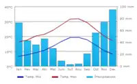 | Moyennes : • Temp. maxi et mini °C • Précipitation mm | |||||||||||