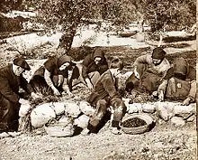 La cueillette des olives se fait du mois de décembre au mois de mai. Au début du XXe siècle, dans les grandes propriétés en Balagne ou dans le Nebbiu, il était fait appel à une main-d'œuvre étrangère lorsque la main d'œuvre féminine locale ne suffisait pas. Par contre, dans les petites oliveraies familiales, les filles de la maison suffisaient souvent à ramasser tous les matins les olives tombées la nuit au pied des arbres[8]. La récolte ne débute que lorsque les fruits ont atteint leur totale maturité[4]. Les olives sont cueillies noires afin de perdre amertume et ardance[13],[3].