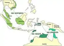 * subsp. cajuputi : Australie du nord, Timor, Moluques * subsp. cumingiana : Malaisie, Sumatra, Kalimantan * subsp. platyphylla : péninsule du cap York (Australie), Papouasie-Nouvelle-Guinée
