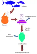 Les usines qui produisent de l'huile de poisson, produisent également des farines de poissons. La plus grande partie de l'huile et des farines sont produites par la méthode de pressage humide.