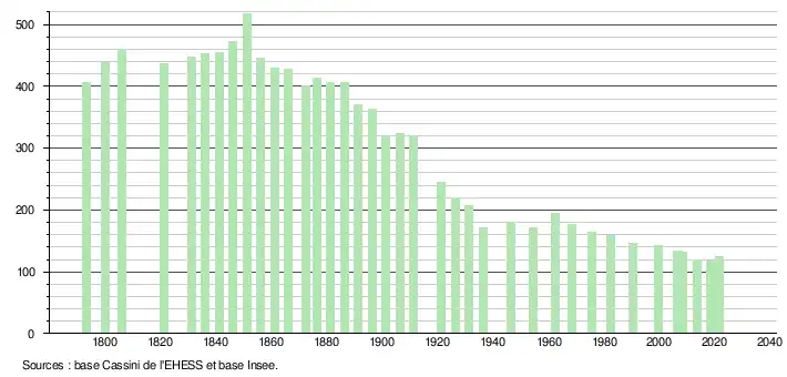 L'évolution du nombre d'habitants est connue à travers les recensements de la population effectués dans la commune depuis 1793. Pour les communes de moins de 10 000 habitants, une enquête de recensement portant sur toute la population est réalisée tous les cinq ans, les populations légales des années intermédiaires étant quant à elles estimées par interpolation ou extrapolation[14]. Pour la commune, le premier recensement exhaustif entrant dans le cadre du nouveau dispositif a été réalisé en 2008[15].