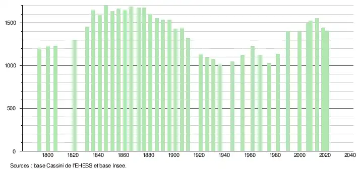 L'évolution du nombre d'habitants est connue à travers les recensements de la population effectués dans la commune depuis 1793. Pour les communes de moins de 10 000 habitants, une enquête de recensement portant sur toute la population est réalisée tous les cinq ans, les populations légales des années intermédiaires étant quant à elles estimées par interpolation ou extrapolation[45]. Pour la commune, le premier recensement exhaustif entrant dans le cadre du nouveau dispositif a été réalisé en 2008[46].