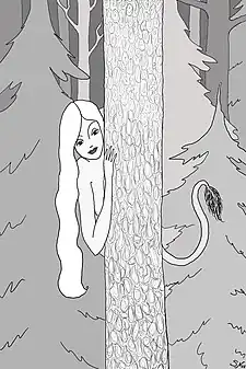- les femmes huldres, ou huldras (mot qui dérive d'une racine norvégienne signifiant « couvert, caché ») sont ravissantes et aiment se travestir en bergères pour séduire les jeunes pâtres, qui sont toujours charmés (les huldres usent même parfois de musique pour ensorceler leur proie[2]) avant de voir la queue de vache (ou de renard si la légende est suédoise et non norvégienne) qui dépasse des jupons de leur dulcinée (qui a généralement aussi le dos creux, ce qui donnerait une autre origine au nom de ces créatures puisque hul signifie « creux »[2]). S'ils acceptent cette infirmité, ils seront comblés car l'huldra se révèle presque toujours une épouse et une mère parfaite[2] (il arrive cependant dans certaines légendes qu'elle décide de faire rôtir ses enfants[4]). Dans d'autres légendes, il arrive qu'une huldre accepte la demande en mariage d'un humain à condition qu'il passe une épreuve pendant une période où ils seront séparés (cette épreuve peut consister à ne parler à personne de leur mariage prochain). Elle vérifiera le résultat au milieu de l'hiver. S'il ne le réussit pas, l'huldra repart, furieuse[3].