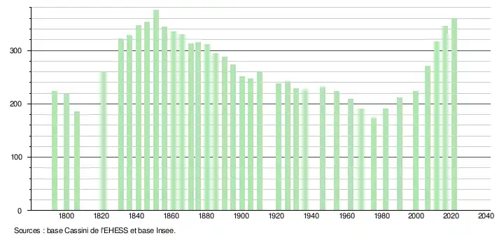 L'évolution du nombre d'habitants est connue à travers les recensements de la population effectués dans la commune depuis 1793. Pour les communes de moins de 10 000 habitants, une enquête de recensement portant sur toute la population est réalisée tous les cinq ans, les populations légales des années intermédiaires étant quant à elles estimées par interpolation ou extrapolation[10]. Pour la commune, le premier recensement exhaustif entrant dans le cadre du nouveau dispositif a été réalisé en 2006[11].