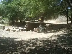 Une description des années 1930 déclare que « la pierre tombale ... est construite en pierres de basalte, d'environ deux mètres de large et 1,5 mètre de long, recouverte de plâtre blanc[8] ».