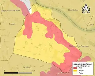 Le retrait-gonflement des sols argileux est susceptible d'engendrer des dommages importants aux bâtiments en cas d’alternance de périodes de sécheresse et de pluie. 99,5 % de la superficie communale est en aléa moyen ou fort (67,4 % au niveau départemental et 48,5 % au niveau national). Sur les 282 bâtiments dénombrés sur la commune en 2019, 282 sont en aléa moyen ou fort, soit 100 %, à comparer aux 84 % au niveau départemental et 54 % au niveau national. Une cartographie de l'exposition du territoire national au retrait gonflement des sols argileux est disponible sur le site du BRGM[19],[Carte 2].