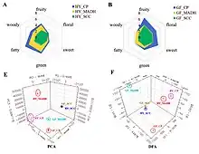 Une analyse qualitative et quantitative fouillée des HE provenant de diverses méthodes d'extraction a été publiée en 2024[22]. Les auteurs isolent 12 composés aromatiques spécifiques sur les 23 que comptent les HE. Les notes florales, sucrées et fruitées sont corrélées au linalol, à l'α-terpinéol et au géraniol, les notes grasses, vertes et boisées avec les germacrène D et B et la nootkatone.