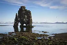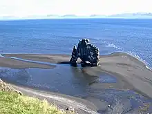 Le Hvítserkur vue depuis la falaise le dominant. | ||