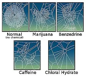 Les araignées préalablement exposées à cette molécule construisent des toiles fortement anormales, phénomène également constaté pour l'exposition à la caféine et à plusieurs substances psychoactives.