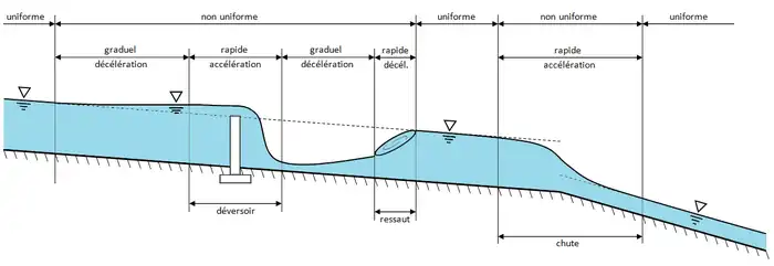 L'écoulement d'un canal est uniforme si la profondeur hydraulique et la vitesse restent invariables dans les diverses sections du canal. L'écoulement d'un canal est non-uniforme si la profondeur hydraulique et la vitesse changent d'une section à l'autre du canal[1].