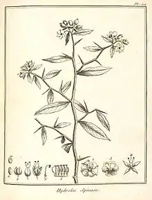 En 1775, le botaniste Aublet qui le premier décrivit Hydrolea spinosa var. spinosa sous le nom de spinosa guianensis, en proposa le protologue suivant[15]: