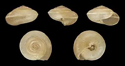 La coquille est de couleur gris blanchâtre à brune, plus ou moins translucide. Elle mesure 6-7 mm de haut pour 9-12 mm de diamètre, à 5 ou 6 tours dextres, le dernier avec une carène et une fine bande spirale blanche à la périphérie. Les stries sont fines et régulières. L'ombilic est très petit et pratiquement obstrué par le bord columellaire. Le péristome est fin, non rebordé[1]. L'animal est gris clair, avec souvent la tête et les tentacules plus sombres[2].