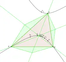 Cette propriété permet d'affirmer que les points de Napoléon (Ni et Ne), les points de Vecten (Vi et Ve), les points de Fermat (F1 et F2) et, par limite, l'orthocentre (H) d'un triangle non isocèle sont sur son hyperbole de Kiepert.