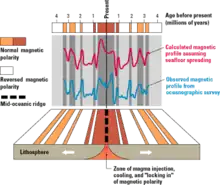 L'hypothèse Vine-Matthews-Morley met en corrélation les modèles magnétiques symétriques observés sur le fond marin avec les inversions du champ magnétique terrestre. Sur les dorsales médio-océaniques, une nouvelle croûte se forme grâce à l'injection, l'extrusion et la solidification du magma. Lorsque le magma refroidit au-delà de la température de Curie, le ferromagnétisme devient possible, ce qui entraîne l'alignement des minéraux magnétiques dans la nouvelle croûte selon le champ géomagnétique ambiant. Une fois refroidis complètement, ces alignements sont figés dans la croûte, la magnétisant de manière permanente[9]. La formation de la lithosphère à la crête océanique est considérée comme un processus continu et symétrique, où la nouvelle croûte s'insinue dans la zone de divergence des plaques. Pendant ce temps, l'ancienne croûte se déplace latéralement, s'éloignant également de part et d'autre de la dorsale. En conséquence, lors des inversions géomagnétiques, chaque côté de la crête conserve un enregistrement d'aimantations rémanentes soit normales (parallèles), soit inversées (antiparallèles) par rapport au champ géomagnétique actuel. Un magnétomètre remorqué au-dessus du fond marin (près de la surface de la mer ou aéroporté) enregistrera des anomalies magnétiques positives (élevées) ou négatives (faibles) lorsqu'il survole la croûte magnétisée dans une direction normale ou inversée. Ainsi, la crête de la dorsale agit comme un "magnétophone à deux têtes", enregistrant l'histoire magnétique de la Terre[11].