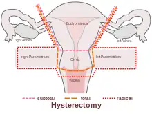 - L'hystérectomie radicale : la suppression complète de l'utérus, du col de l'utérus, de la partie supérieure du vagin, et du parametrium. Indiquée pour le cancer. Les ganglions lymphatiques, les ovaires et les trompes de Fallope sont généralement éliminés dans cette situation, comme pour l'hystérectomie de Wertheim[8].