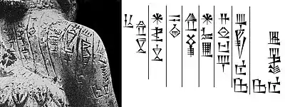 Cette statuette, inventoriée sous le matricule M. 1486 au musée national d'Alep, de 27,7 centimètres de hauteur en albâtre présente le souverain en marche, le pied gauche en avant, une position habituelle pour les figures masculines[1]. Les mains sont ramenées en avant, mais contrairement à la plupart des statuettes d'orants de la même période, le poignet droit repose dans la main gauche[1]. Autre élément inhabituel, les yeux sont simplement sculptés, là où la statuaire de Mari propose habituellement des incrustations[1], lapis-lazuli, nacre et bitume notamment. Le nez est martelé, les cheveux tirés vers l'arrière en chignon sont maintenus par un bandeau évoquant possiblement un postiche, la barbe légèrement ondulée tombe en longues mèches sur la poitrine[1]. Ce traitement de la barbe est à rapprocher de celui du casque de Meskalamdug ou la mise en scène d'Eannatum de Lagash sur la stèle des vautours[1]. La robe, un kaunakès, possède neuf rangées de mèches dont une partie recouvre l'épaule gauche et se terminant sur l'arrière par la queue de mouton, animal dont la laine sert à la confection de ce type de vêtement[1]. Ce traitement est plutôt inhabituel pour un homme[1]. Ces différences, par rapport à la statuaire mariote habituelle, est peut-être la manifestation d'une singularité des artisans de cette ville avec une influence marquée du Sud mésopotamien[1]. L'inscription, pour finir, présente le fait que le roi se proclame grand ensi d'Enlil, le dieu protecteur de la royauté, faisant écho à la ville de Nippur, renforçant cette idée d'une influence méridionale[1].