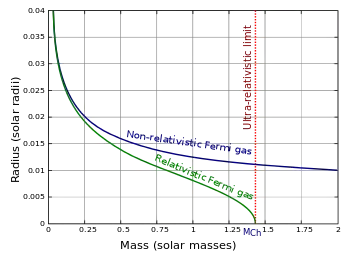 Lorsqu'une naine blanche approche la limite de Chandrasekhar de 1,44 masse solaire, la pression de radiation n'est plus suffisante pour s'opposer à la gravité et l'étoile s'effondre. Quand le noyau est constitué principalement d'oxygène, de néon et de magnésium, l'étoile formée est dans la plupart des cas une étoile à neutrons. Dans ce cas, seule une partie de la masse de l'étoile est alors éjectée[45]. Si, au contraire, le noyau est composé de carbone et d'oxygène, une fraction substantielle de l'étoile entre en fusion nucléaire durant un court laps de temps, à la suite de l'effondrement. L'étoile explose alors sous la forme d'une supernova de type Ia[46].