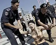 - (en) « Cop tries to tackle Femen protester, falls into a wall [Le policier qui essaie de tacler la protestataire FEMEN tombe contre un mur] », The Daily Dot, (lire en ligne).