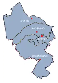 La communauté rurale de Jasnovskoje selskoje posselenije (ru. Ясновское сельское поселение) est créée en 2008[8]. Il comprend 17 colonies qui appartiennent auparavant aux districts villageois de Jasnowski selski okrug et Prochladnenski selski okrug (de), avec 4 359 habitants (en 2010)[9] qui vivent sur une superficie de 445 km². Fin 2015, la communauté est dissoute et ses villes sont intégrées au nouveau arrondissement urbain de Slavsk.
