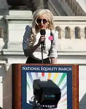 Cyndi Lauper, chanteuse ayant connu le succès avec le titre Girls Just Want to Have Fun, sorti en 1983, devient grâce aux paroles de cette dernière (la libération de la femme), une des icônes de la communauté gay dans les années 1980[80],[81]. Elle s'investit par la suite dans les activités du mouvement LGBT[82], en organisant le True Colors Tours, une série de concerts en faveur des droits de la communauté gay[83].