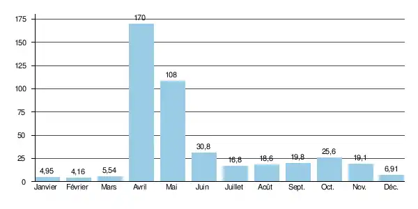 Le débit moyen mensuel observé en février (minimum d'étiage) est de 4,16 m3/s, soit à peine plus de 2 % du débit moyen du mois d'avril, maximum de l'année (170 m3/s), ce qui montre l'amplitude très importante des variations saisonnières. Sur la durée d'observation de 44 ans, le débit mensuel minimal a été de 1,99 m3/s en , tandis que le débit mensuel maximal s'élevait à 428 m3/s en .