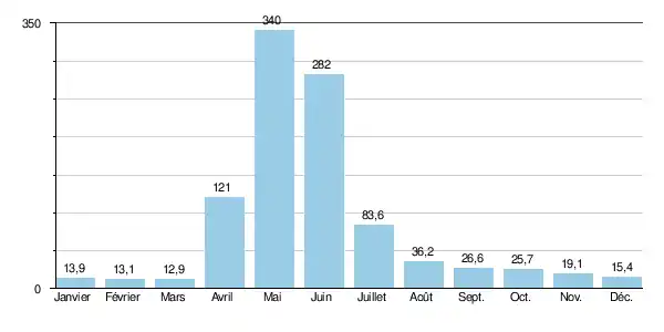 - les hautes eaux se déroulent d’avril à juin inclus, avec un maximum en mai, et correspondent à la fonte des neiges. Dès le mois de juillet, le débit de la rivière baisse rapidement, ce qui mène, après une brève transition,