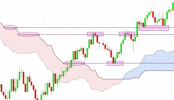 Tout comme les autres lignes de l'Ichimoku, le nuage permet de dégager des lignes de support/résistance. En effet, une SSA ou SSB plate (c'est-à-dire que l'un des bords du nuage est plat) est un signe que le marché a stagné d'une certaine manière sur ces niveaux et que ces zones ont été travaillées. La SSB est à cet égard plus forte que la SSA (voir ci-dessus) : un niveau défini via une SSB sera potentiellement plus travaillé par les prix qu'un niveau extrait de la lecture de la SSA.