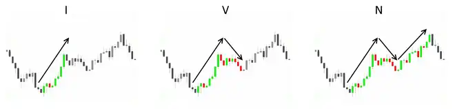 • une vague N : il s'agit d'une vague avec trois segments, composée d'une impulsion avec une correction (une vague V) et un segment secondaire qui fait office d'impulsion secondaire.