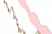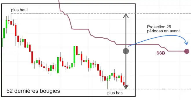 Deuxième frontière du nuage, abrégée en « SSB ». Il s'agit du milieu du plus haut et du plus bas des 52 dernières périodes, projeté 26 périodes en avant (on peut la voir comme une Kijun sur 52 périodes mais décalée vers l'avant). La SSB est une ligne « plus forte » que la SSA dans le sens où sa période est plus grande. En d'autres termes, elle est plus difficile à traverser et peut faire office de support/résistance.
