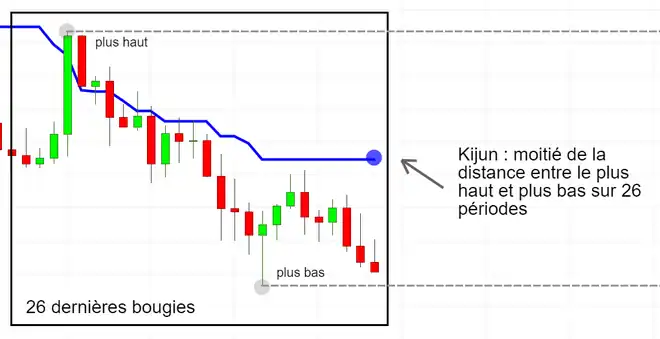 Souvent abrégée en « Kijun » ou KS, il s'agit du milieu entre la valeur du plus haut et la valeur du plus bas sur les vingt six dernières périodes observées. Le calcul est le même que la Tenkan, sauf que la période est différente.