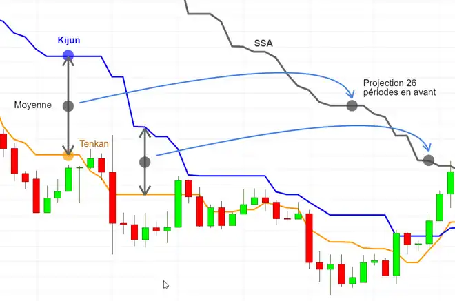 La raison du décalage de 26 périodes vient du fait qu'Hosoda considérait un cycle de 76 bougies, Jun, et le nuage ainsi construit indique le niveau d'équilibre sur lequel les prix retourneraient si on considère qu'ils ont fini leur évolution (sommet ou creux atteint).