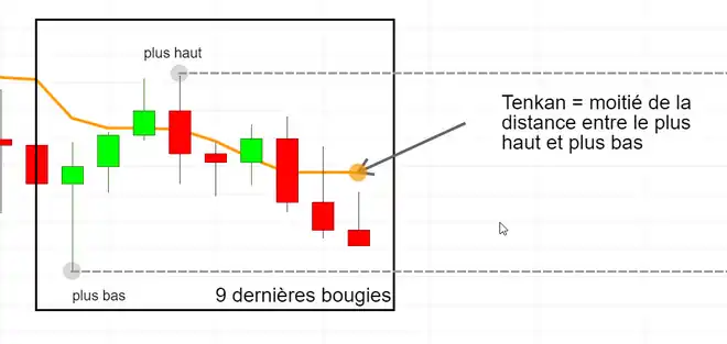 Souvent abrégée en « Tenkan » ou TS, il s'agit du milieu entre la valeur du plus haut et la valeur du plus bas sur les neuf dernières périodes observées (en horaire une session de bourse compte neuf heures). Cela peut être vu comme le prix d'équilibre (le milieu entre le plus haut et le plus bas) sur neuf périodes de cotation :