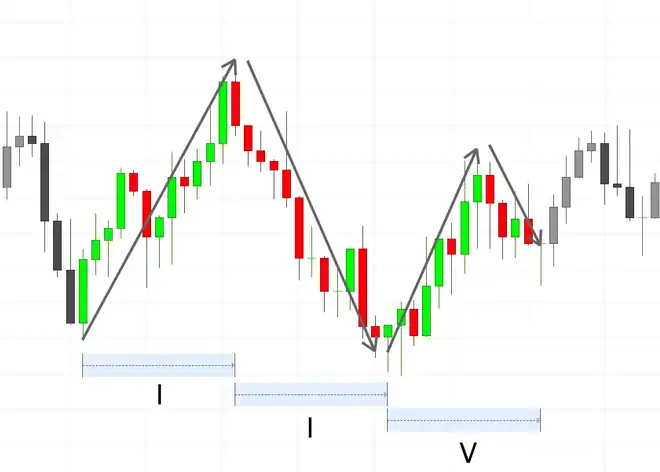 • une vague V : il s'agit d'une vague avec deux segments, composée d'une impulsion (une vague I) et d'un mouvement correctif ;