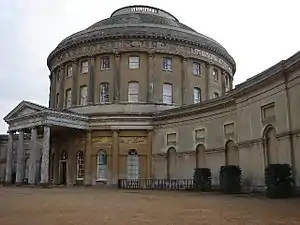 La rotonde est flanquée d'ailes étroites segmentaires à un étage (apparaissant comme une arcade aveugle) reliant, à la manière palladienne, à deux pavillons terminaux; ces ailes segmentaires sont brisées en leur centre par des baies en saillie qui abritent le fumoir et la salle pompéienne, tous deux ajoutés plus tard au XIXe siècle.
