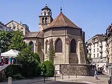 Dans cette ville germanophone[17], c'est probablement pour réduire l'influence des anabaptistes au sein du protestantisme francophone strasbourgeois que Bucer pousse Calvin — qui n'a jamais été ordonné ni prêtre ni pasteur consacré[38] — à prendre la tête de la paroisse de protestants réfugiés francophones de France et de Wallonie. Cette communauté forte d'environ quatre cents membres[39] forme l'« Église française »[40] ou « Église des français »[41].