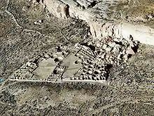 Vue aérienne de la grande maison de Pueblo Bonito de la culture Chaco, entre 800 et 1100. Elle compte 350 pièces rectangulaires, 32 kivas et trois grandes kivas (sales communautaires circulaires).