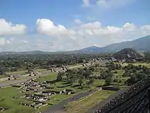 Teotihuacan. Vue sur la chaussée des Morts et la pyramide de la Lune depuis la pyramide du Soleil.