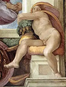 Dans son premier projet pour la voûte, Michel-Ange avait prévu de peindre des anges pour accompagner les figures des douze apôtres initialement envisagés. Les Ignudi, même dépourvus d'ailes, s'interprètent aussi comme les successeurs de ces anges (Emison, 1998). L'œuvre de Michel-Ange présente d'ailleurs des précédents montrant des êtres non ailés que leur ambivalence permet d'interpréter comme des anges, comme par exemple les figures à l'arrière-plan de la Vierge à l'escalier et les anges sans ailes de la Création d'Adam[1].