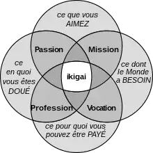 L'ikigai (生き甲斐, aussi orthographié ikigaï, formé de 生き (iki), « vie », et de 甲斐 (kai), « qui vaut la peine », avec rendaku) est l'équivalent japonais de la « joie de vivre » et de la « raison d'être ». Selon un article du journal Le Monde, ikigai permet de trouver sa raison d'être[1].