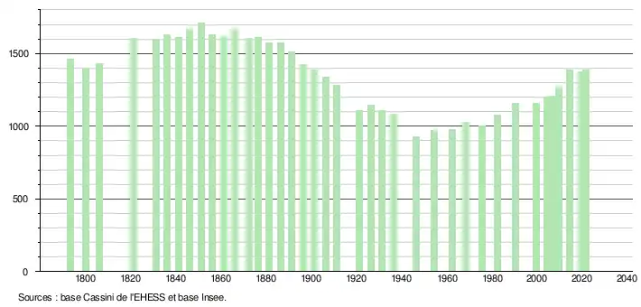 L'évolution du nombre d'habitants est connue à travers les recensements de la population effectués dans la commune depuis 1793. Pour les communes de moins de 10 000 habitants, une enquête de recensement portant sur toute la population est réalisée tous les cinq ans, les populations légales des années intermédiaires étant quant à elles estimées par interpolation ou extrapolation[28]. Pour la commune, le premier recensement exhaustif entrant dans le cadre du nouveau dispositif a été réalisé en 2004[29].