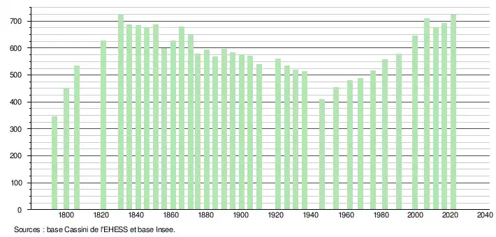 L'évolution du nombre d'habitants est connue à travers les recensements de la population effectués dans la commune depuis 1793. Pour les communes de moins de 10 000 habitants, une enquête de recensement portant sur toute la population est réalisée tous les cinq ans, les populations légales des années intermédiaires étant quant à elles estimées par interpolation ou extrapolation[22]. Pour la commune, le premier recensement exhaustif entrant dans le cadre du nouveau dispositif a été réalisé en 2006[23].