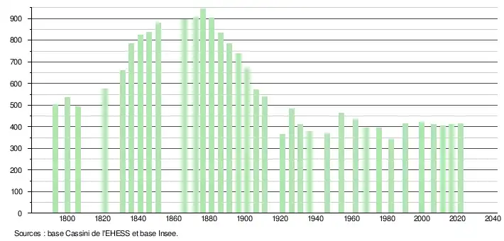 L'évolution du nombre d'habitants est connue à travers les recensements de la population effectués dans la commune depuis 1793. Pour les communes de moins de 10 000 habitants, une enquête de recensement portant sur toute la population est réalisée tous les cinq ans, les populations légales des années intermédiaires étant quant à elles estimées par interpolation ou extrapolation[19]. Pour la commune, le premier recensement exhaustif entrant dans le cadre du nouveau dispositif a été réalisé en 2006[20].
