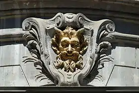 Le rez-de-chaussée de cette tour d'angle présente une alternance de pilastres massifs et de baies cintrées dont les clés d'arc sont ornées de mascarons décorés de visages de diables dorés.