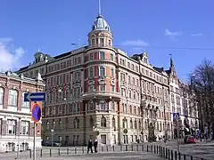 L'immeuble de 6 étages est conçu par Axel Högberg pour l'artiste peintre Erik Färlander. Des habitants s'y installent à partir du . L'immeuble change plusieurs fois de propriétaire avant d'être acheté par le gouvernement russe en 1904[2]. Des gendarmes russes y habitent, par la suite l'immeuble abrite le département finlandais de l'Okhrana, la police secrète russe, (en finnois : Ohrana), la direction de la gendarmerie ainsi que des officiers de l'armée russe. Durant la guerre civile finlandaise, l’immeuble a probablement été utilisé par les gardes rouges[2]. En 1918, l'immeuble devient propriété de l'état finlandais et aura différentes fonctions.