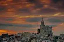 Avec ses 89 m de haut et ses 15 étages, sa silhouette asymétrique et son horloge rouge bien visible la nuit, le bâtiment reste un repère dans la bouillonnante Gran Vía, surnommée le « Broadway madrilène ».
