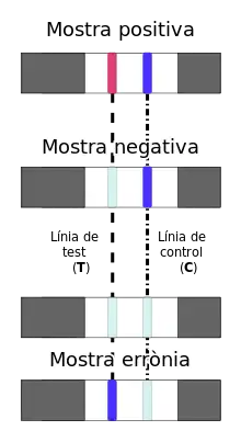 La plupart des tests comportent une deuxième ligne qui contient un autre anticorps (non spécifique de l'analyte) qui se lie à certaines des particules colorées restantes qui ne se sont pas liées à la ligne de test. Cela confirme que le liquide est bien passé du tampon d'application de l'échantillon à la ligne de test. En confirmant que l'échantillon a eu la possibilité d'interagir avec la ligne de test, cela augmente la confiance dans le fait qu'une ligne de test visiblement altérée peut être interprétée comme un résultat négatif (ou qu'une ligne de test altérée peut être interprétée comme un résultat négatif dans un test compétitif).