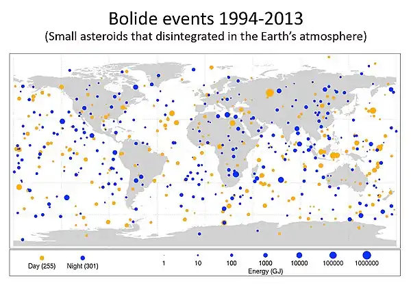 Les objets ayant un diamètre entre 5 et 10 mètres entrent en collision avec la Terre en moyenne une fois par an. L’énergie dégagée est équivalente à celle d'une petite bombe atomique. L'énergie est généralement dissipée dans la haute atmosphère car presque la totalité des matières solides se vaporisent durant la rentrée atmosphérique[18].